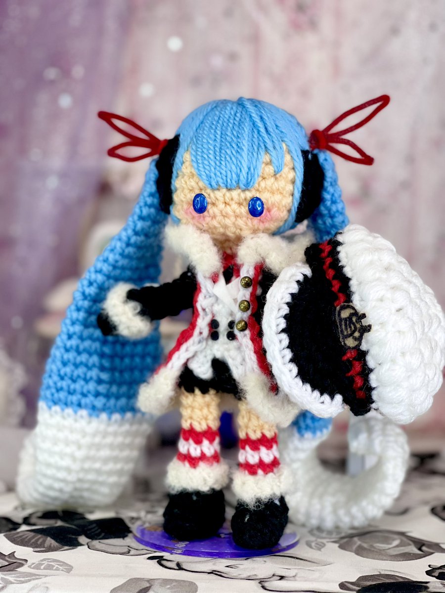 3 24 晴れてネ🌈雪ミク2023、とーとつに作ってみました❄️✨ 思ったようにボンネットが作れず…😢 でも、プロトタイプなので可愛い💕 雪祭り❄️に連れて行ってくれるマスターさん、居るだろうか… #テオ印 #雪ミク2023 #あみぐるみ 23/01/29 22:18