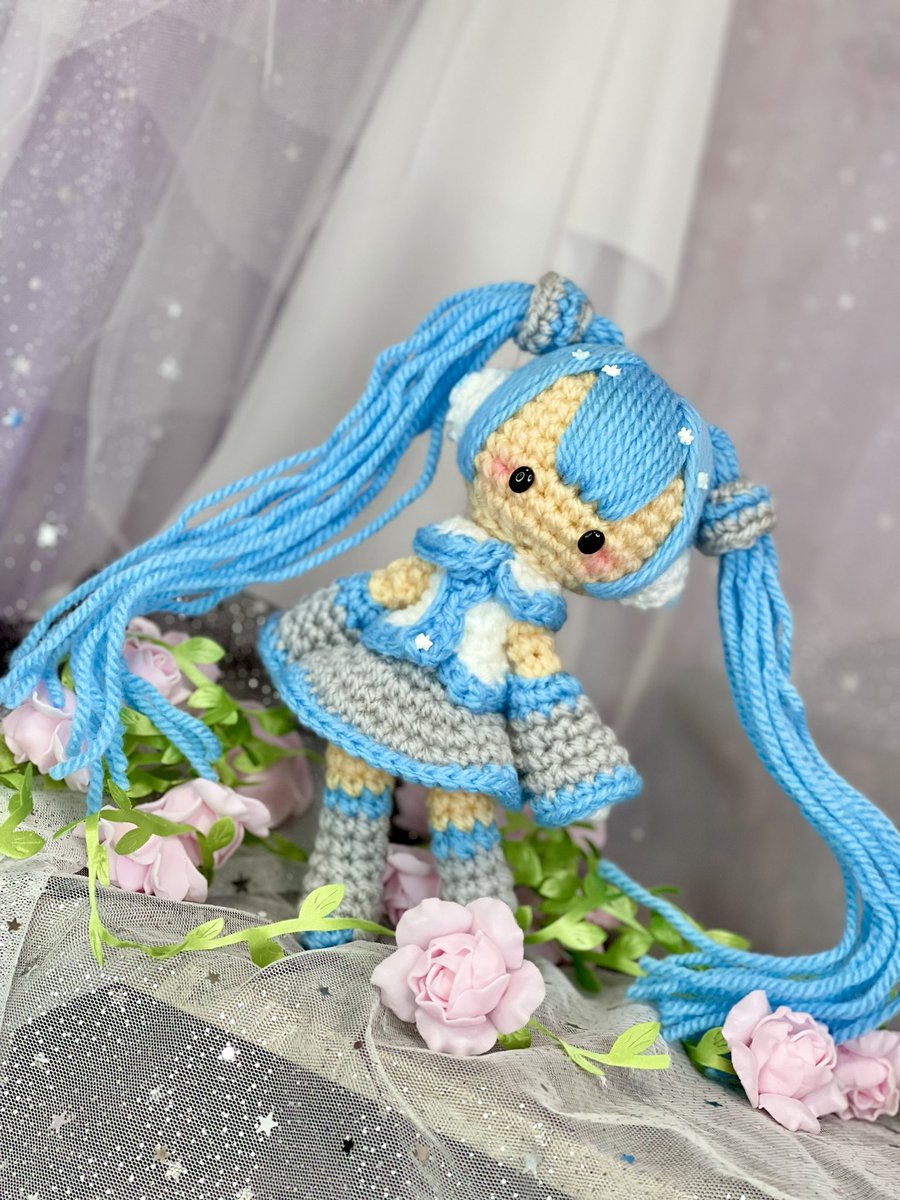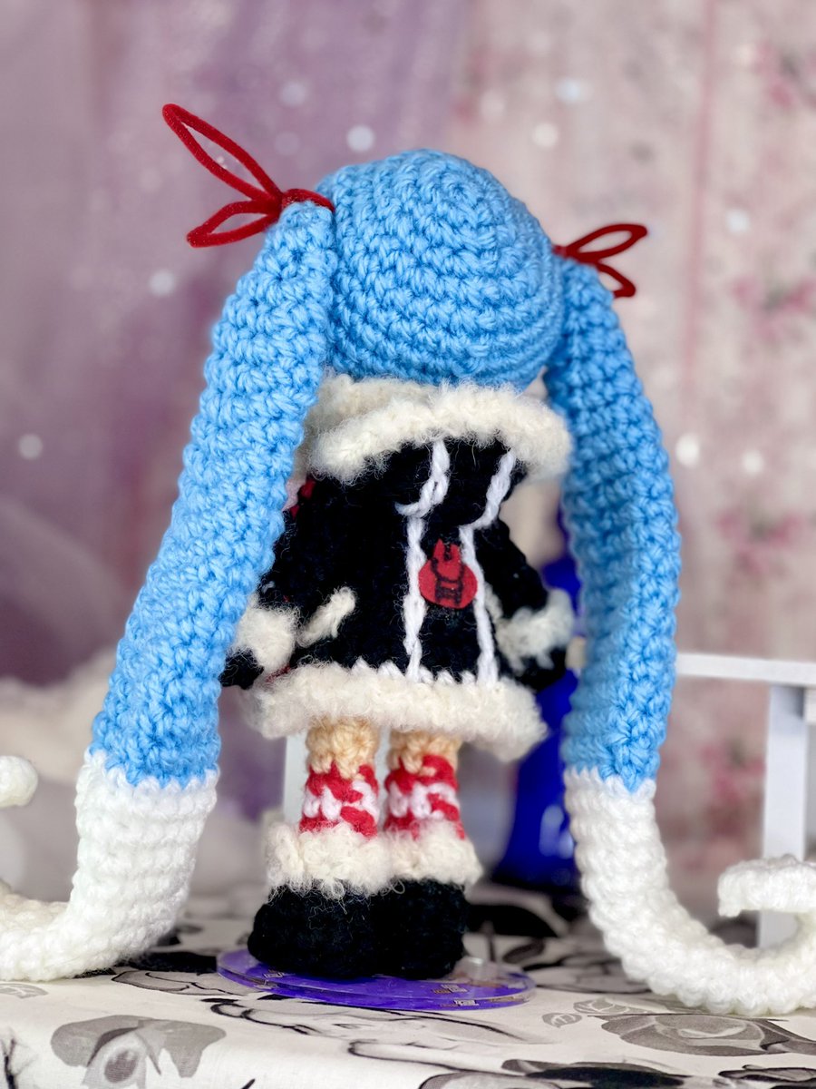 晴れてネ🌈雪ミク2023、とーとつに作ってみました❄️✨ 思ったようにボンネットが作れず…😢 でも、プロトタイプなので可愛い💕 雪祭り❄️に連れて行ってくれるマスターさん、居るだろうか… #テオ印 #雪ミク2023 #あみぐるみ
