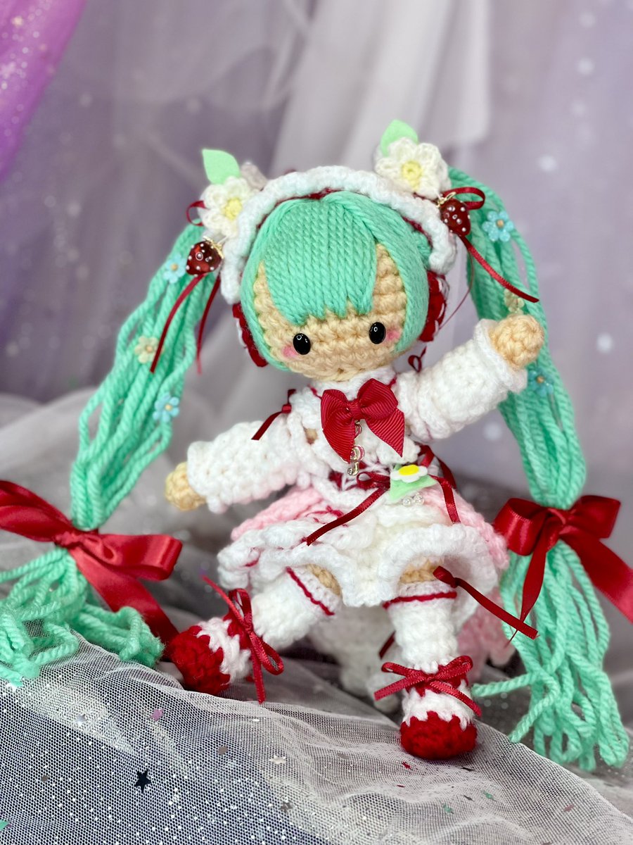 イエス!ウィー ミク!!! 苺🍓ミクさん、リクエスト品完了しました。 頑張りました✨ #あみぐるみ #テオ印 #初音ミク #初音ミク15th