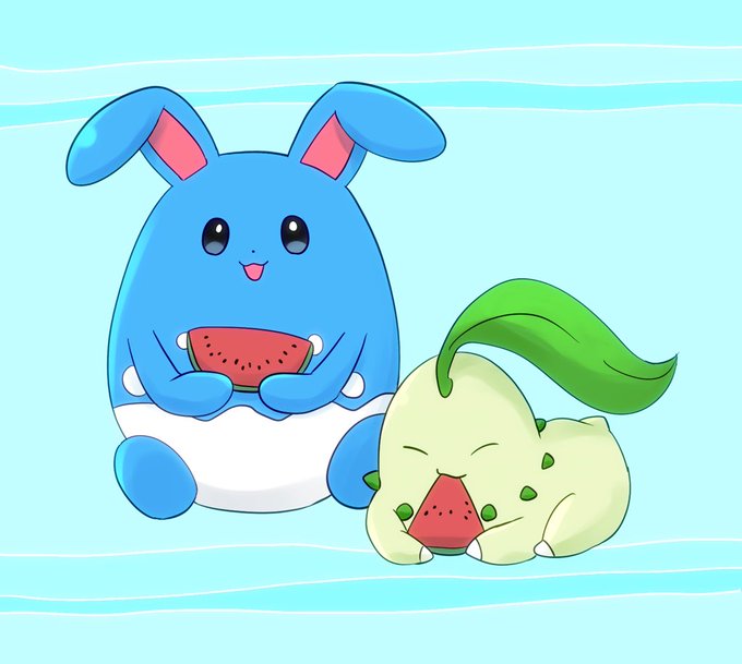 チコリータとマリルリの夏🍉 #ポケモンイラスト