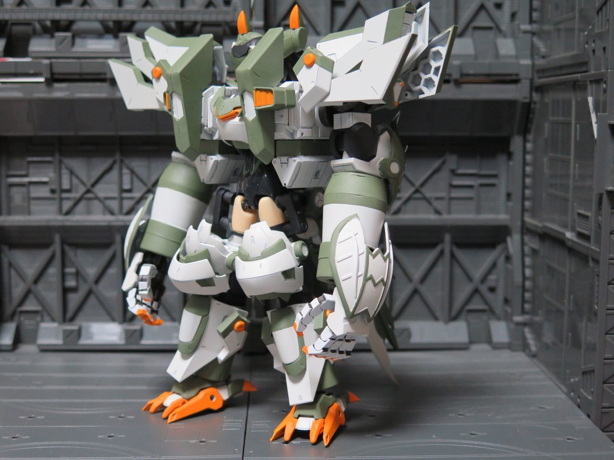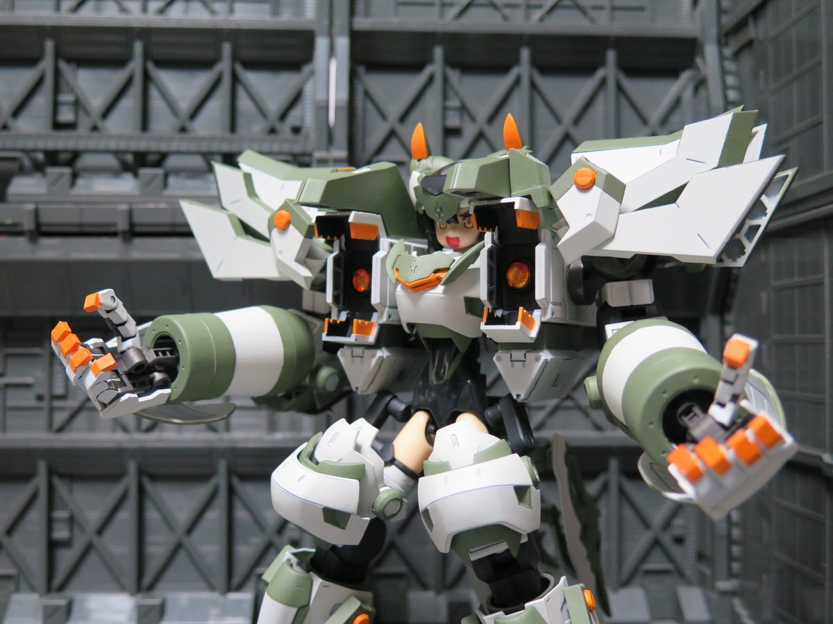 武装神姫ハウリン:オリジナル武装「皇牙吠凛(オーガハウリン)」完成しました 大部分はMSGの組み合わせで、頭・胴体・足にそれぞれFAガールシルフィー・メガミデバイスSOLホーネット・メガミデバイス朱羅忍者のパーツを使用しています 以下武装紹介リプライに続きます
