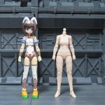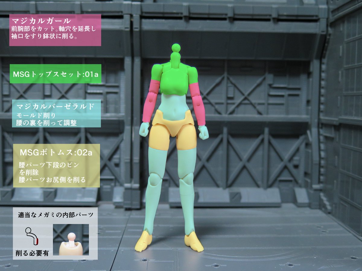 マジカルバーゼの肌色胴体・マジカルガールの腕・メガミMSGのトップス・ボトムズを組み合わせて smallサイズの肌色素体を作ってみた 具体的には肌色胴体のモールドを消し 前腕を切り詰め 腰内側の干渉する部分を削り 胴体側も少し削りました 胴体ジョイントが合わないので余ってたパーツを使ってます