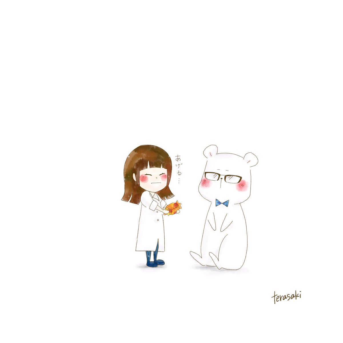 【となりのくまさん】_14 《はっぴーばれんたいん》 てらさきは何か隠しながらやって来ると、くまさんにサプライズプレゼントをあげました 嬉しくて泣いてしまうくまさん これからもよろしくねとぎゅっと抱きしめて仲良く過ごすのでした #となりのくまさん #絵描きさんと繋がりたい