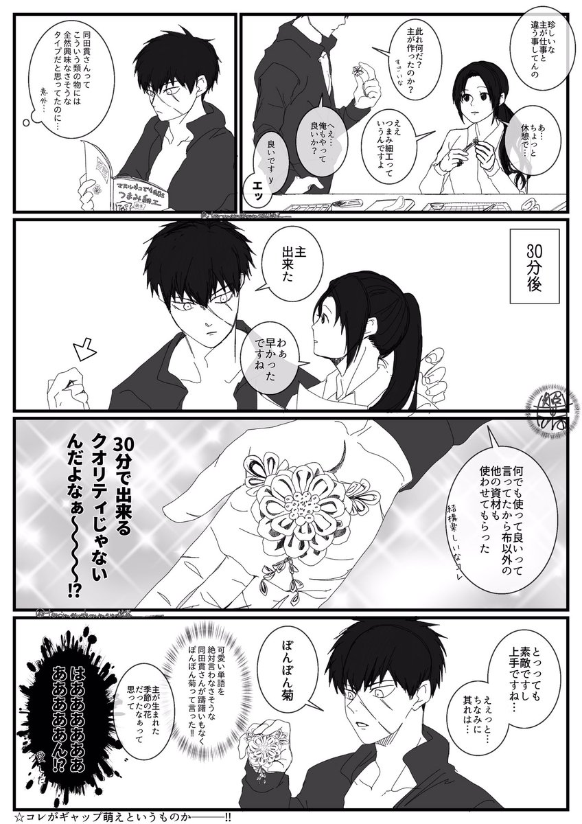 727 3006 【弊本丸昔ばなし】 【就任7ヶ月の審神者と特になった同田貫さん】 審神者「研修で聞いた同田貫の話とかなりかけ離れてて吃驚したしギャップ萌えした。頂いたつまみ細工は机に飾ってます」 同田貫さん「結構楽しかった」 21/05/07 01:16