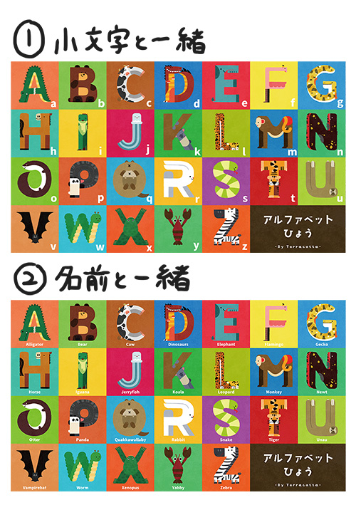 #100日チャレンジ 53日目! アルファベット表を作成しました!普段あまり使えていませんが、こういうの作るときにイラレは便利ですね!😆🙌 レイアウトを①と②どちらにしようか悩んでいまして…😓投票を作りますので、ご意見いただけたら嬉しいです!🙇✨ #動物好きな人と繋がりたい