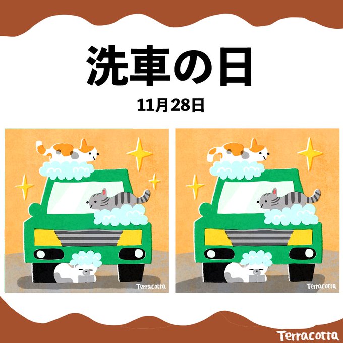#今日は何の日 洗車の日! この猫ちゃんたちは、洗っているというより遊んでるが近いですね😂笑 今日も間違い3つ探せるかな?😉 #イラスト #illustration #絵柄が好みっていう人にフォローされたい #ゆるいイラスト #間違い探し #保育 #絵本