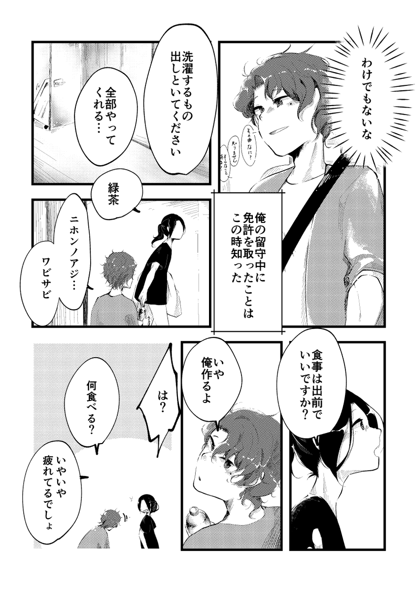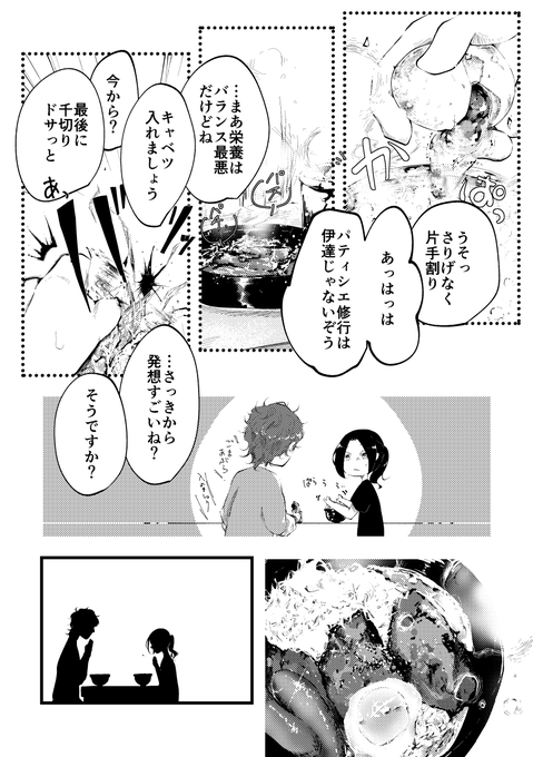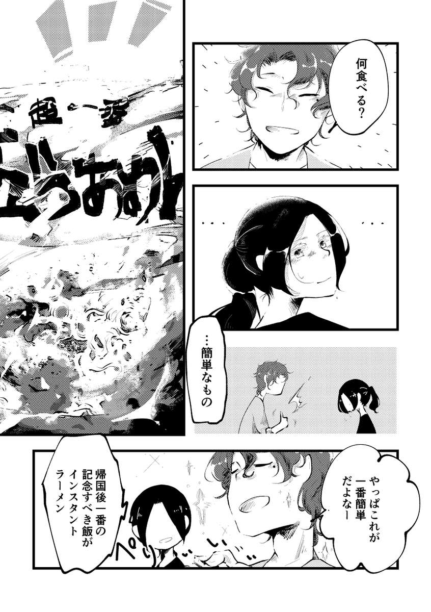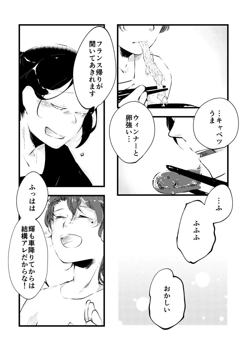 【創作】男子大学生がごはん食べるだけ(1/2) パティシエ修行のためフランスへ旅立った青年と、彼を追いかけて進学してきたのに突然留学でほっぽり出された青年が、一年間の遠距離恋愛期間を経て戻ってきた後のショート漫画です(あらすじ) ※一応BL作品です #漫画が読めるハッシュタグ