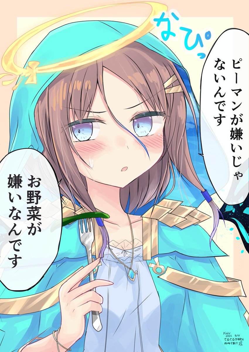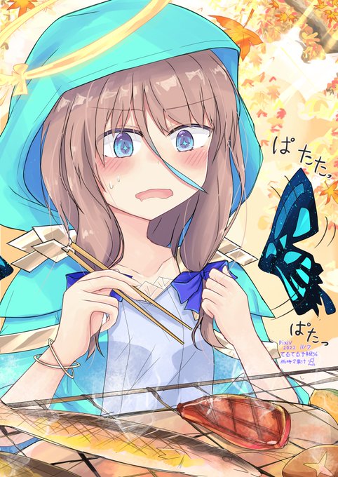 24 66 #イラスト #創作 最初に肉と魚ばかり焼いて野菜だけ残って絶望しそうなナピリエルちゃん…! 22/11/07 18:19