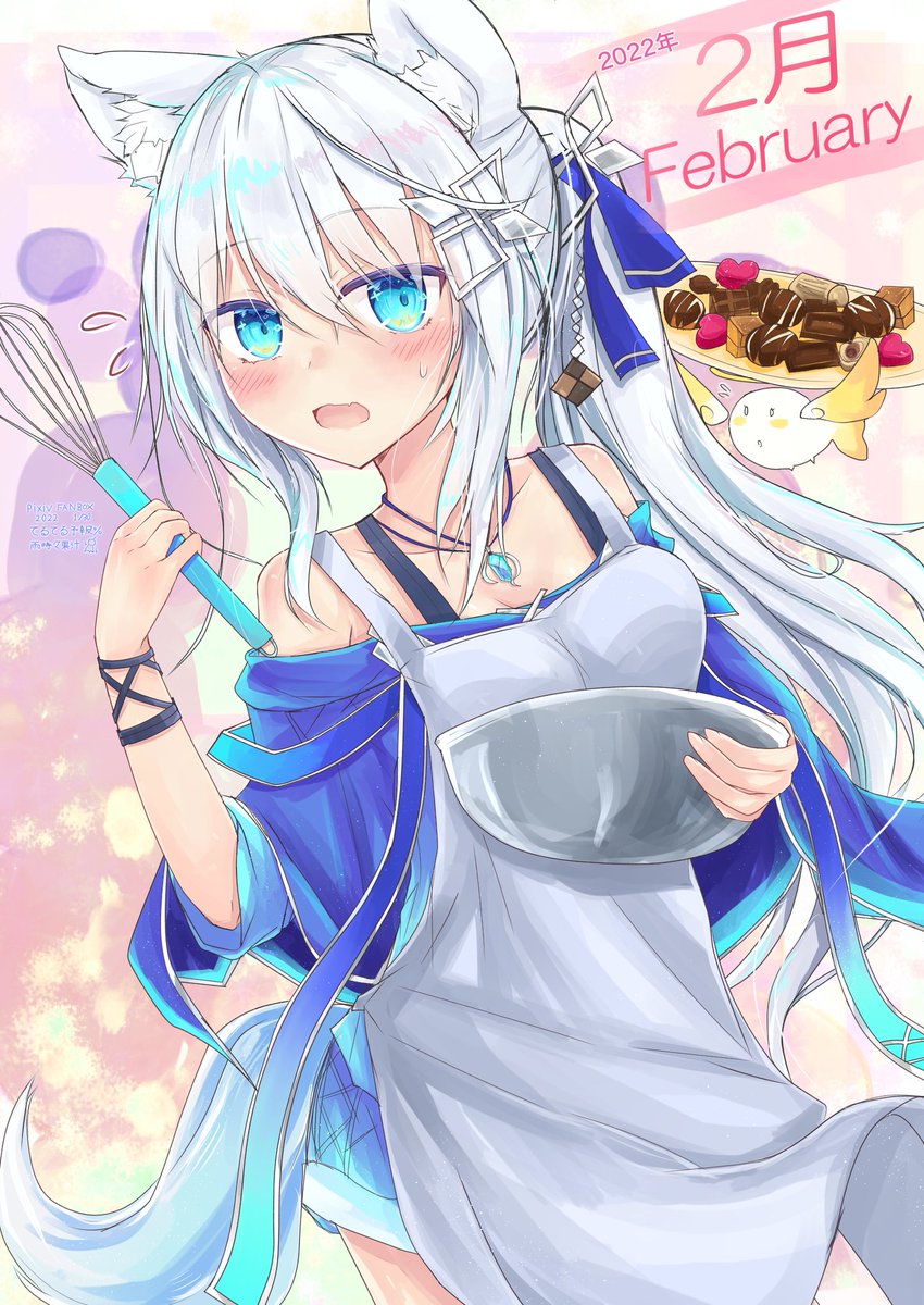 #今年も残りわずかなので今年一番伸びた絵を貼る 2月のチョコ作りおおかみちゃん! 普段はストレートヘアな子が作業とかするときに括ってポニテにしてるのいいよね(*´﹃`*)