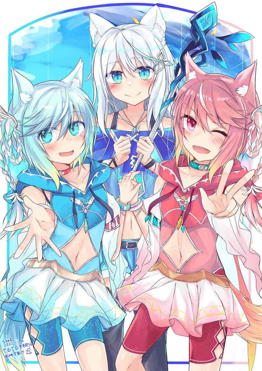 25 52 コミッションにて狼牙様(@Black_White_SP)ご企画の「創作おおかみちゃんシリーズ」にて私デザインの子と双子のミアちゃんラテちゃんのコラボイラストを描かせていただきました…! キャラデザや塗りなどとても勉強になることばかりでした(*´˘`*) この度は本当にありがとうございました!✨✨ 22/11/27 17:39