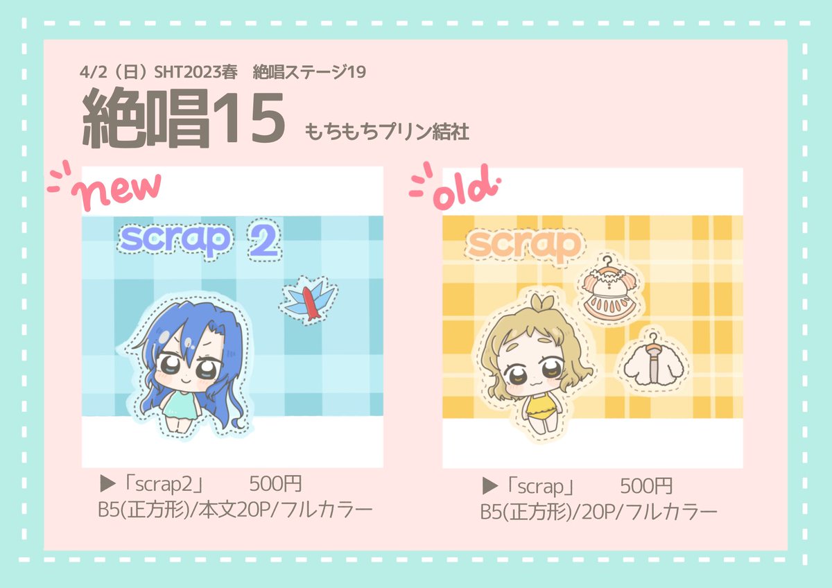 4月2日SHT2023春 絶唱ステージ19 ▽《絶唱15》お品書き▽ 色紙とクロッキーに描くイラストはTwitterにもちょこちょこあげていきます。 サークル参加者さんは本のみお取り置き可能になりますお気軽にリプください🌸