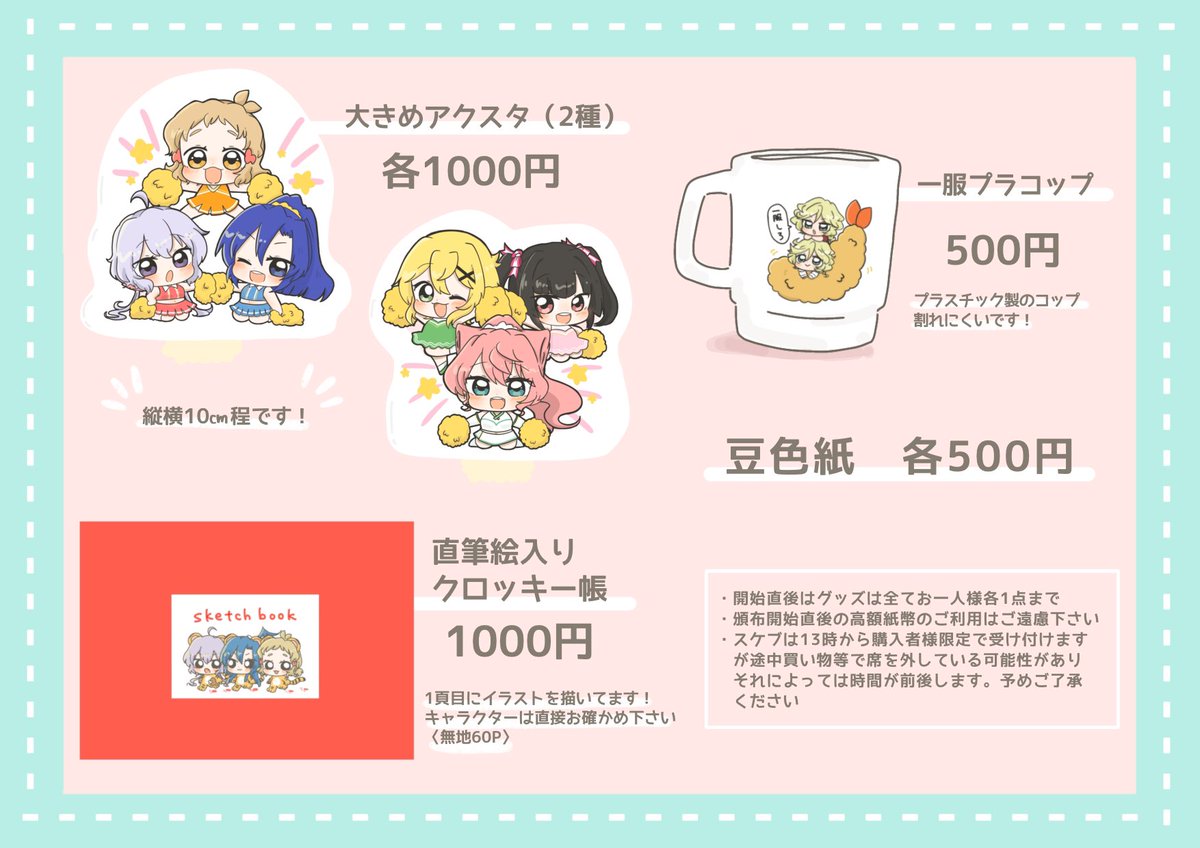 68 111 4月2日SHT2023春 絶唱ステージ19 ▽《絶唱15》お品書き▽ 色紙とクロッキーに描くイラストはTwitterにもちょこちょこあげていきます。 サークル参加者さんは本のみお取り置き可能になりますお気軽にリプください🌸 23/03/25 22:06