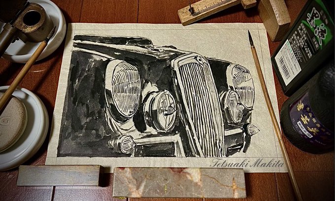【木版画 No.91】 1951 Lancia Aurelia B20 ◎2007年制作 《墨絵160×233㎜》 《版木160×233㎜① ②表と裏で一枚》 《木版画160×230㎜》 #牧田哲明作品展2022 #inkpainting #墨絵 #woodblockprint #木版画 #lanciaaurelia #ランチアアウレリア #lanciaaureliab20 #tetsuakimakita