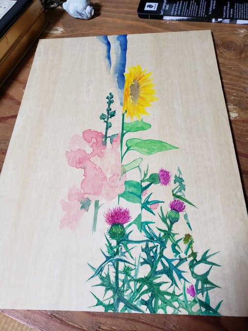 ちょびちょび進んでおります #途中経過 #花の絵 #春の絵 #水彩 #板 #workinprogress #watercolor #springart #flowerart #japaneseartist