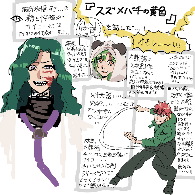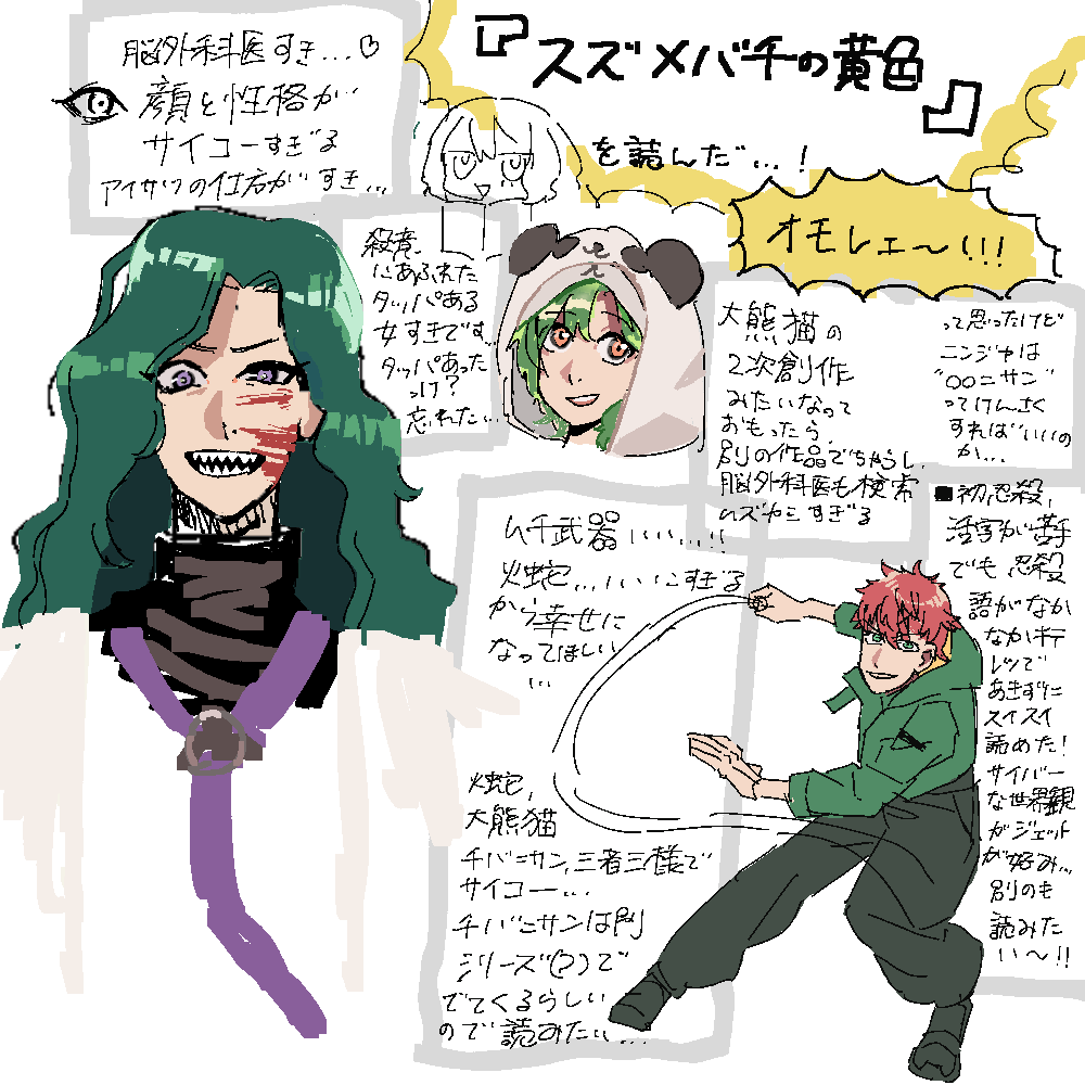 スズメバチの黄色を読んだので感想メモしました! 活字苦手なんですけど忍殺語のおかげでサクサク読めました キャラが魅力的で面白かった〜! 脳外科医が好きです… #ウキヨエ