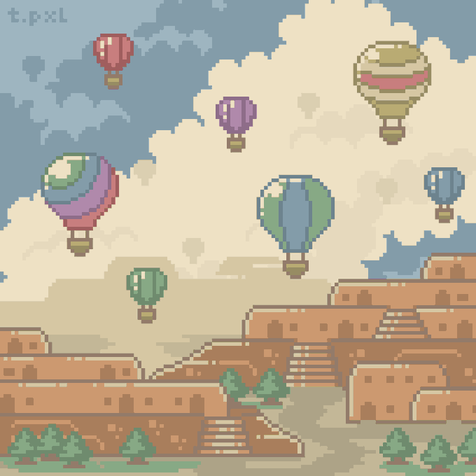 Hot air baloons. Again, I used #paperpixels palette by @_V3X3D, I just love the colors.😊 #pixelart #pixelartist #ドット絵