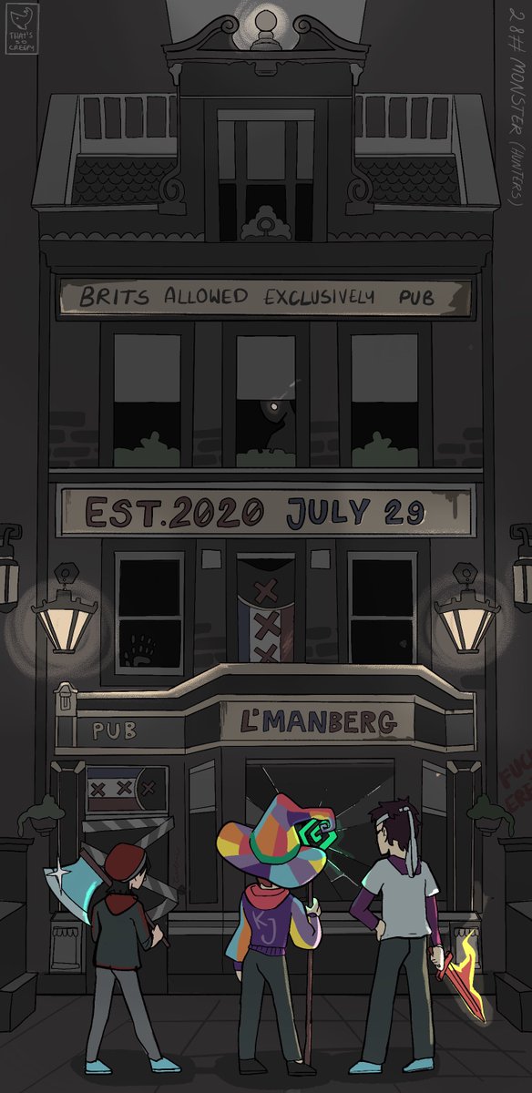 Day 28 Monster (hunters) Part of my and @reichiorchid 's AU! Where monsters took den in a bar called L'manberg #KARLNAPITY #karlnapityfanart #karljacobsfanart #quackityfanart #sapnapfanart #dreamsmp #mcytfanart #karlnapityau