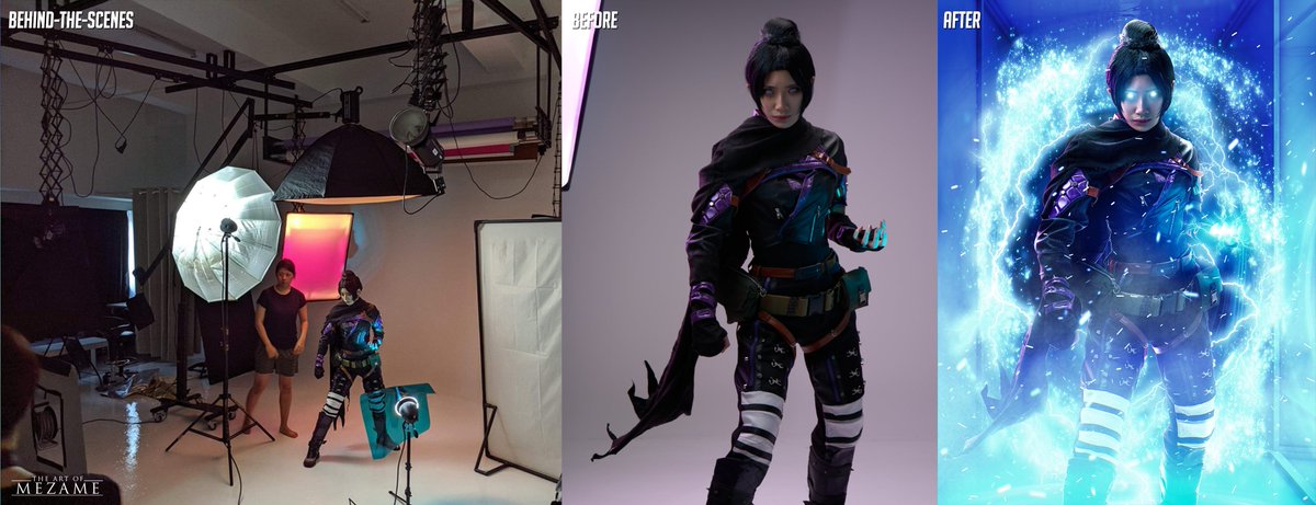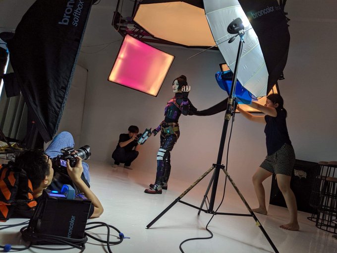 From yesterday: Where possible, having a good and familiar team makes any task more efficient - from setting up, to tossing capes for dynamic poses and to doing behind-the-scenes footage for archival. #broncolor #sonyalpha #apexlegends #cosplay #photography