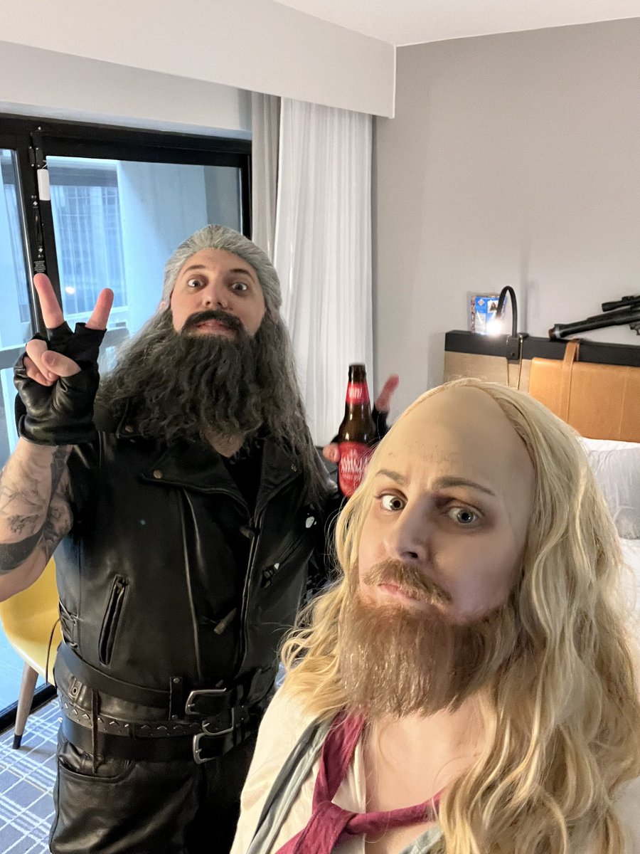 We decided after watching #OurFlagMeansDeath that we HAD to costume it at #DragonCon2022 so @Hydraworx decided she had to be Buttons. I decided to become Blackbeard, & this was the result. This was a 10min bald cap job and blending & we were super happy with the result! #cosplay
