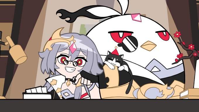 フカさん誕生日おめでとう!素裳ちゃんと立雪ちゃんにピィちゃん、そしてちびフカさん&識ちゃん’sでお祝いじゃ! #崩壊3rd #HonkaiImpact3rd #長空市立美術館