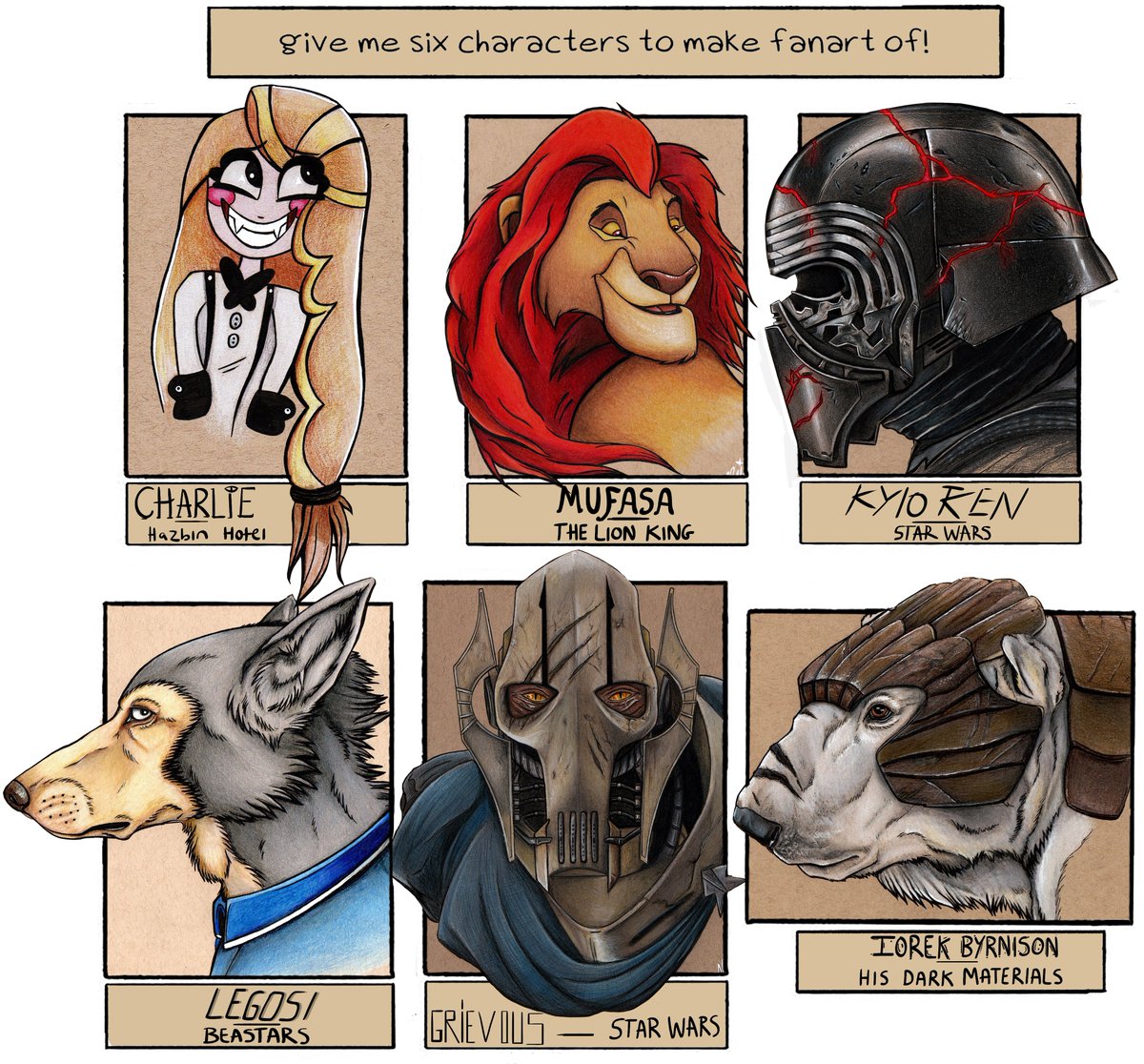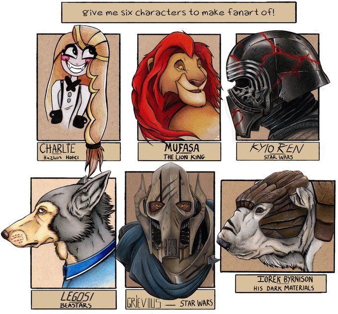 It is DONE! My second #SixFanartsChallenge is complete. What I bunch I ended up with but they were all super fun to work on, each with their own challenges. #SixFanarts #StarWars #HazbinHotel #disney #BEASTARS #hisdarkmaterials #ArtistOnTwitter #art #hbo #Hunicast #fanart #draw