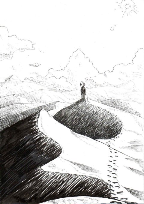 13. Dune ~ #inktober2020 Seul, sur une dune, au milieu d'un désert. Le vent souffle légèrement et emporte quelques grains de sables sur son passage pour les déposer un peu plus loin. Ce silence, quasiment total, est apaisant... . Encre noire, format A5. #inktoberday13 #inkart
