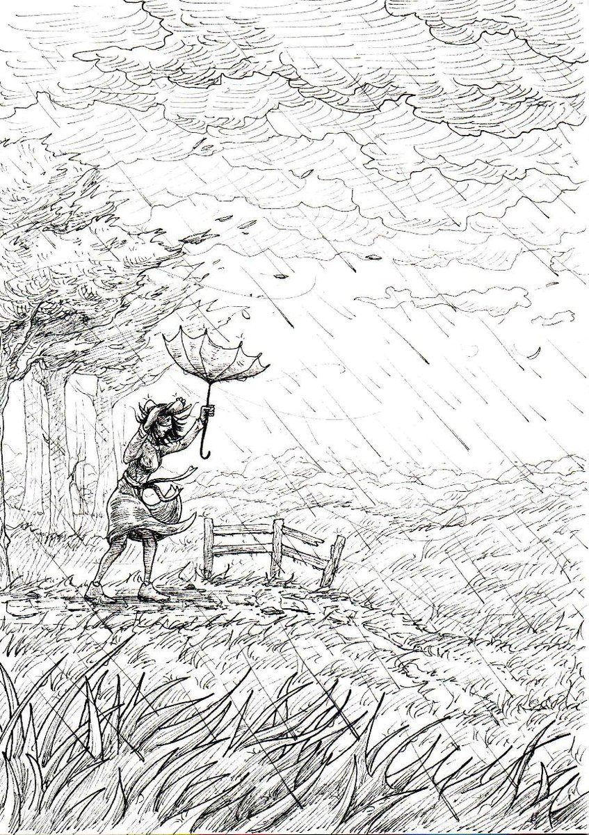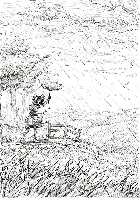 17. Storm / tempête ~ #inktober2020 Une femme, prise au dépourvu par une tempête, tente, du mieux qu'elle peut, de se protéger des intempéries soudaines avec son parapluie endommagé... Je lui souhaite bien du courage ! #inktoberday17 #inkart #InkDrawing