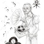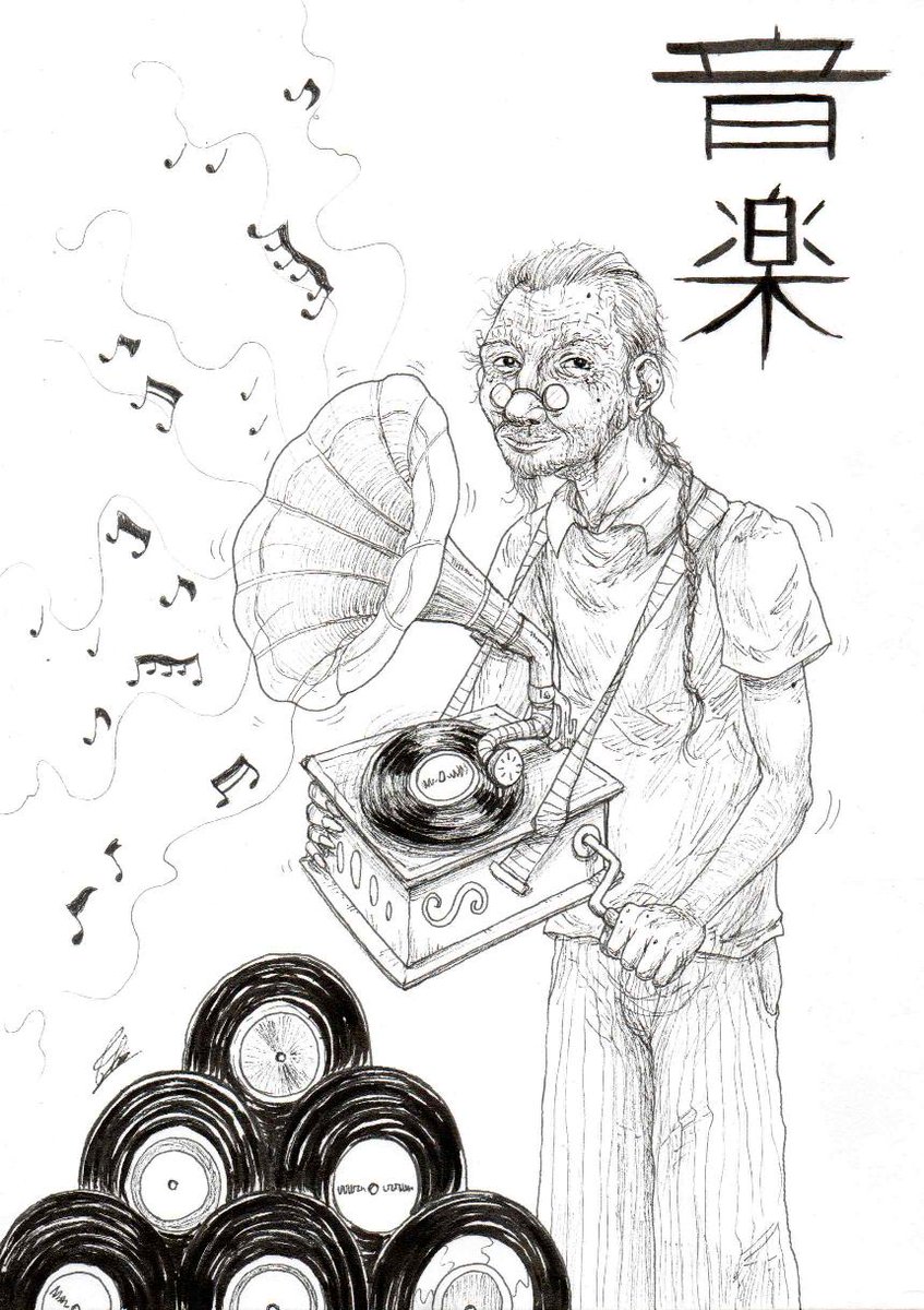 27. Music / musique ~ #inktober2020 Maître Vinyle nous joue sa plus belle musique. Pour l'occasion, il a ressorti son vieux gramophone préféré et il a nettoyé toute sa collection de précieux vinyles. C'est un véritable honneur qu'il nous fait là ! Quel bonheur pour les oreilles !