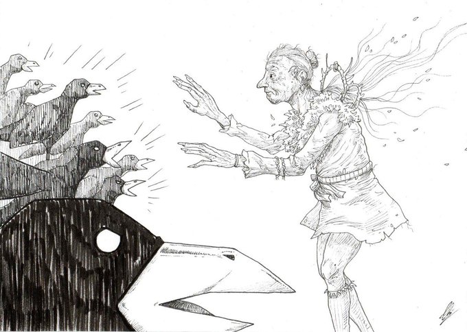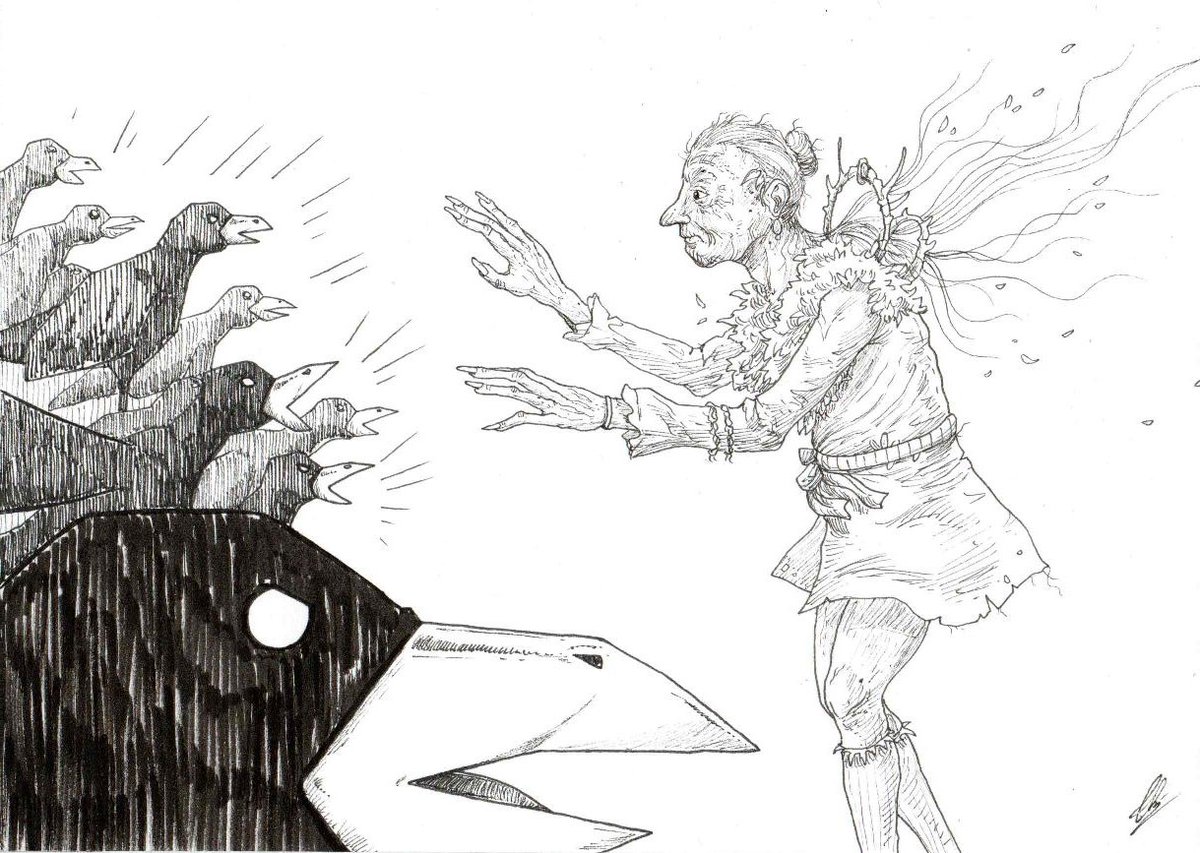 30. Ominous / De mauvais augure ~ #inktober2020 "Allez-vous en, oiseaux de mauvais augure !" Pour cette vieille dame, ces corbeaux représentent un mauvais augure mais, du point de vue des corbeaux, c'est probablement l'inverse... Tout dépend de comment on interprète les choses...