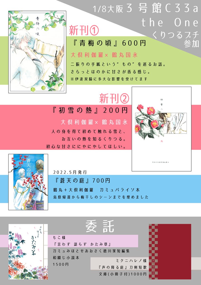 新刊できたよ!!!お花見するくりつるのお話。 「はるをのむ」8P/100円 サンプルは抜粋です。 今日はこちらのコピー本と、既刊の青梅の頃、 それと1月インテで委託していた、もこさんのミュ徳川家短編集を今回もお預かりしております! お品書きはこちら pixiv.net/artworks/10774…