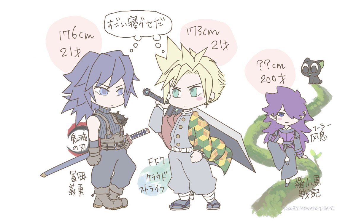 3 34 櫻井孝宏さん繋がりで冨岡、クラウド、フーシーの髪の毛ピンピントリオです。この3人特に好き! ピンピンといってもクラウドだけは毎日セットしてそうで他はナチュラルピンピン笑 服は勝手に入れ替えました〜(*´∀`*) 共通点多いと思いまして #櫻井孝宏 #羅小黒戦記 #FF7R #鬼滅の刃イラスト 21/01/06 17:47