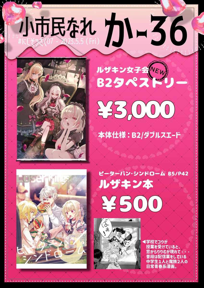 #にじそうさく07 委託通販の予約始まりました!ご入用の方はよろしくお願いします 🌹ルザキン女子会タペストリー melonbooks.co.jp/detail/detail.… 🦇ルザキン本(再版) melonbooks.co.jp/detail/detail.…
