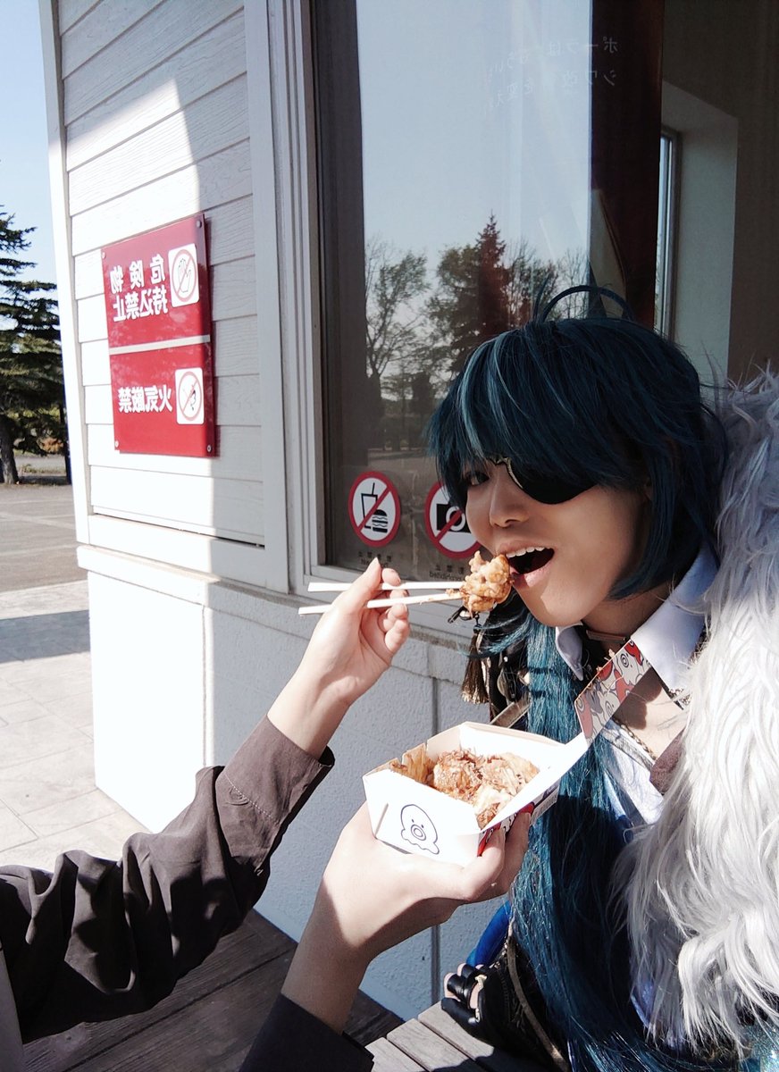 2 10 おにぎり食べてる義弟 ガイアさんにコート貸してるディルック(自分) コートが萌え袖になったガイアさん(@Rainさん) #レラコス 23/05/14 18:51