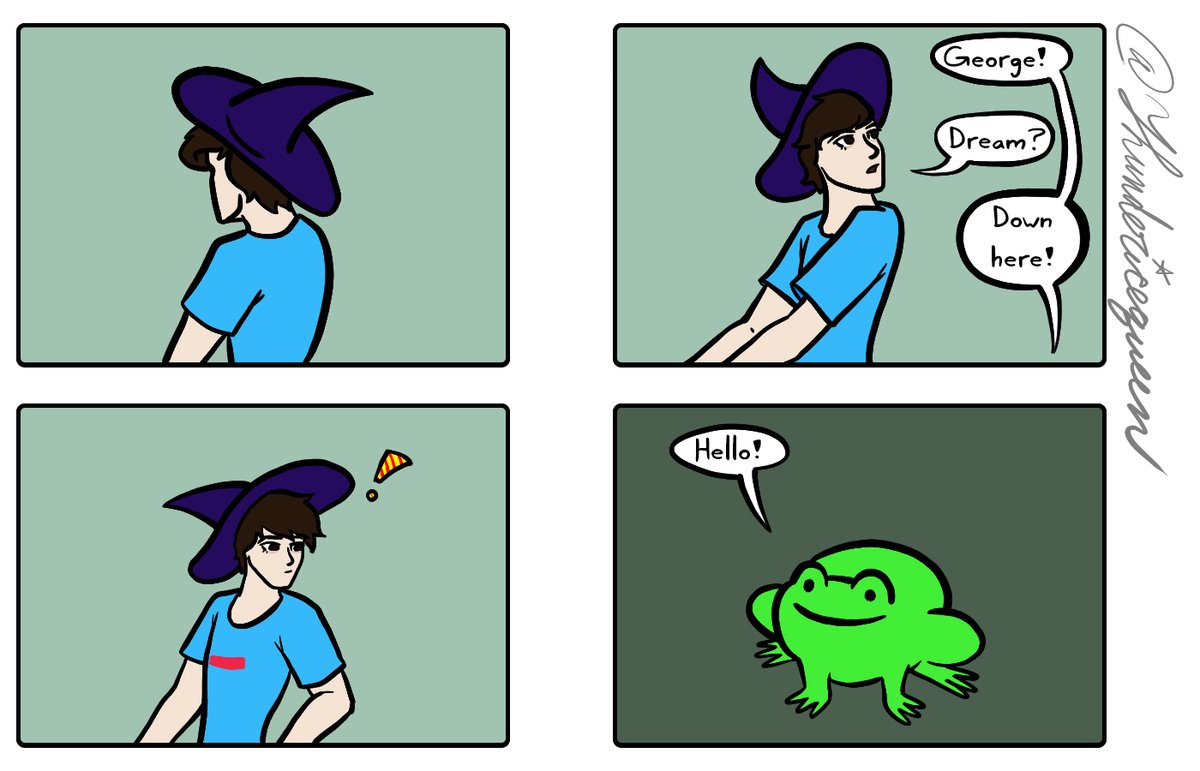 Hmm what's this? Frog comic part 2, perhaps? But... What's that in the foreground? Find out when the comic releases soon! Like actually soon, not Soon™. #dreamfanart #georgenotfoundfanart
