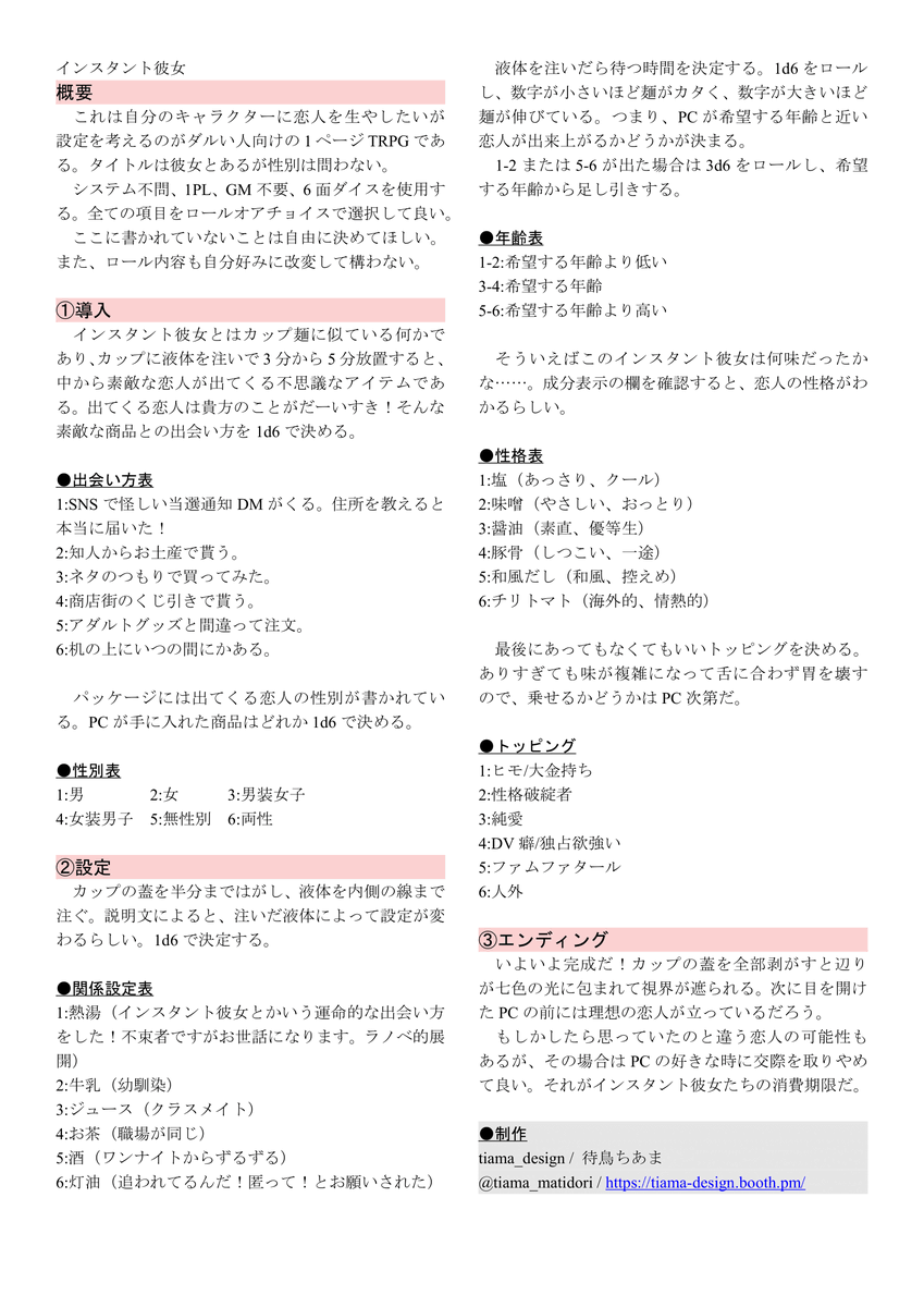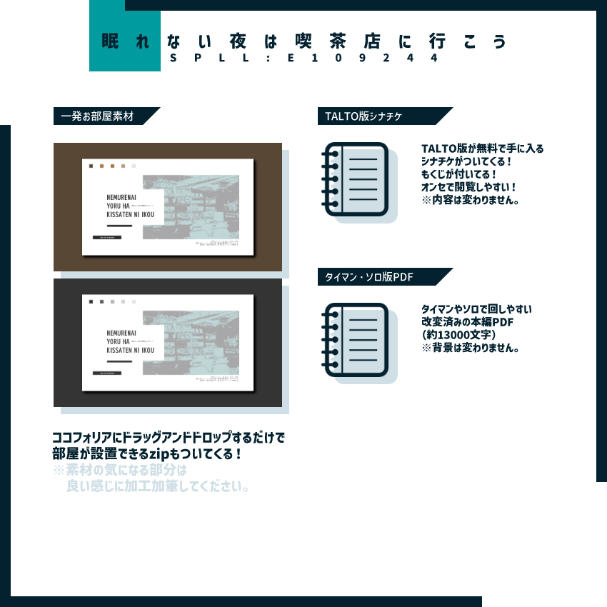 【眠れない夜は喫茶店に行こう】 テーマ ▶ 睡眠 システム:#クトゥルフ神話TRPG 第6版 形式:KPレス/ソロ/タイマン 概要:深夜の喫茶店でバリスタバイトしながら眠れない客の相手をするSAN回復シナリオ。 #微睡みとサナトリウム 様参加シナリオです。 配布開始しました☕ tiama-design.booth.pm/items/4110156