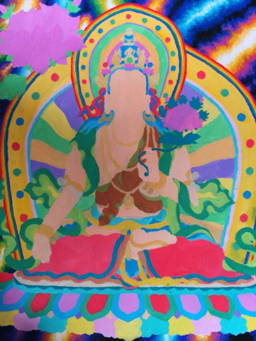 緑ターラーのアクリル画を書いている。日数的にこの絵が個展用最後の絵になるかもしれない。 あと午後よりお寺さんが来て取材するみたい。楽しみだ😁 #絵描きさんと繋がりたい #アクリル画 #緑ターラー