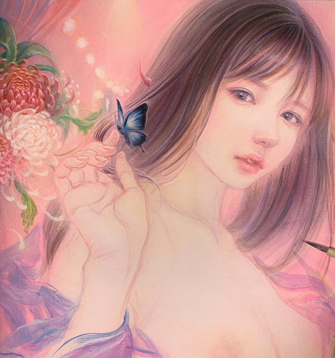 今日は、蝶と髪の毛をがんばりました。 もう寝なければー。 時間が許すならずっと描いていたい。 #絵柄が好みって人がいればいいなぁ #wip