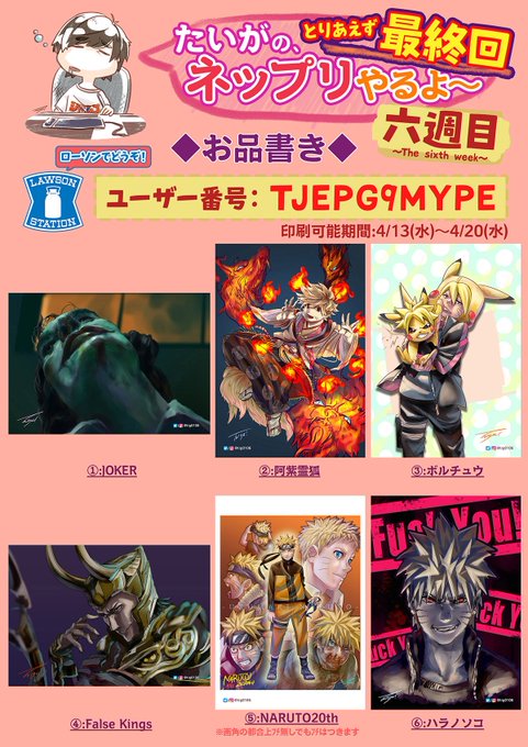 【たいがのネップリ📸】 💥遂に最終回💥いきます🎉✨ ●ユーザー番号:TJEPG9MYPE ●場所:ローソン🏪 ●印刷可能期間:4/13(水)〜4/20(水)昼迄 ●価格:1枚30円~(2Lは80円) 下記に拡大画像も掲載↓ #ネップリ #イラスト #絵描きさんと繫がりたい #絵師さんと繋がりたい