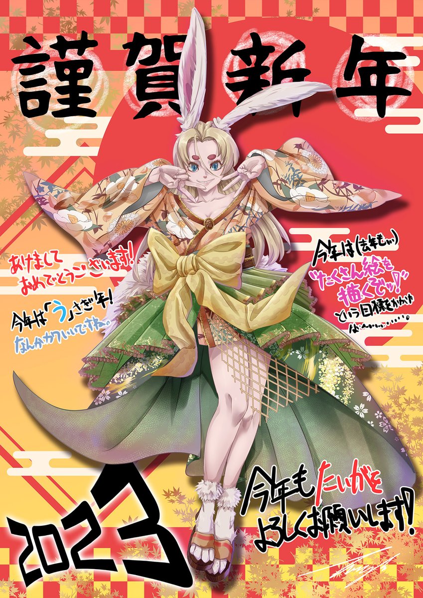 【年賀状】 (遅ればせながら…) 「コトシハタクサンエヲカキマス!」(白目) 今年もやんわりよろしくお願いいたします皆様☺ #年賀状2023 #年賀イラスト #絵描きさんと繋がりたい #イラスト好きな人と繋がりたい