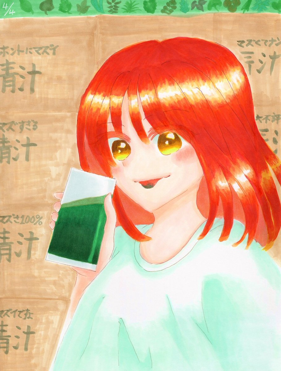 4月4日の獅子の日に描いてたらくがきを本格的に塗った絵✏️ 獅子の好物なので青汁にかなり力を入れましたჱ̒ ー̀֊ー́ ) #創作イラスト #アナログイラスト #コピック