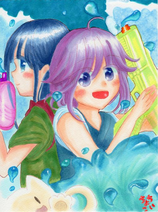 夢乃といちみと水鉄砲 今年は水しぶきを沢山描いた気がするけど…難しい💧 #オリジナルイラスト #コピック