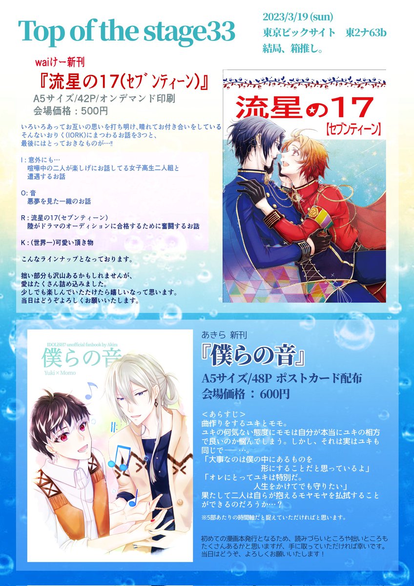 《 3/19 トプステ 》 お品書きと いおりく本サンプルです 『流星の17(セブンティーン)』 ページ数/42P(表紙4P含む) サイズ/A5サイズ 価格/500円 3つの短い二人のお話 pixivではあきらちゃんのユキモモ本 『僕らの音』も見れます✨ pixiv.net/artworks/10608… 1/3