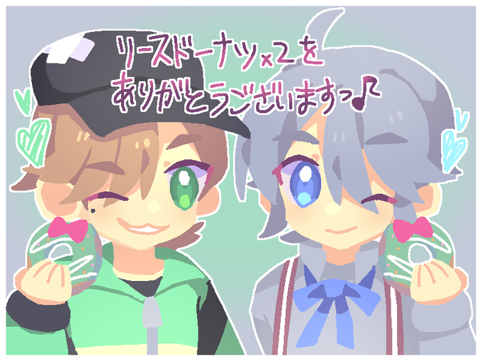 レンタカーコンビへ、リースドーナツをありがとうございます🍩🍩 二人宛にドーナツが同日に届いたので、仲良しコンビで描かせていただきました💙💚 chocobox.me/c/MTAwNjI0Nw== #チョコボックス🍫 #chocobox_tikokuda
