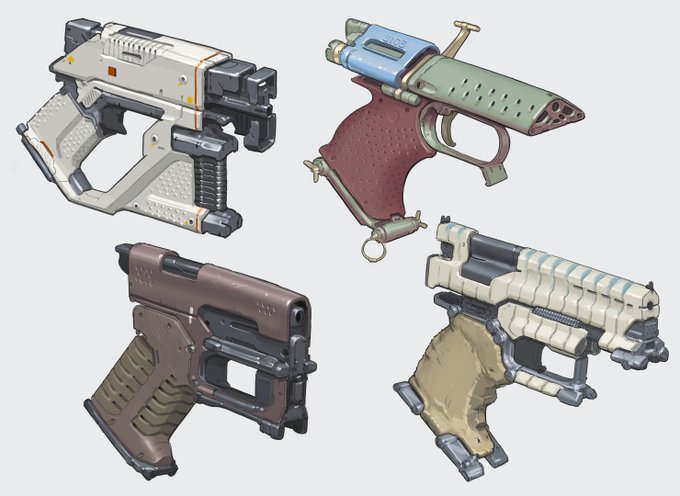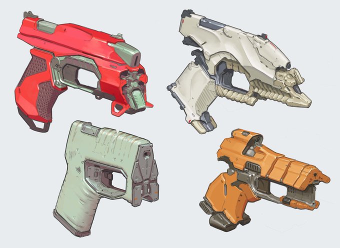 200 2134 I have updated this collection of guns. The one on the top left uses liquid propellant. The one in the middle is called "the compensator". Is there one you would pick for your scifi adventure? 23/07/18 22:49