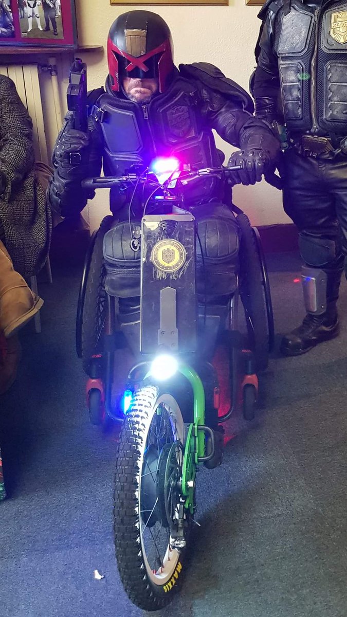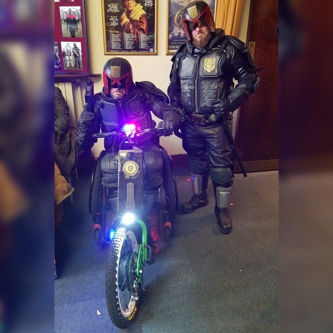 I can never resist posting pics of cosplaying in my wheelchair even if it gets boring to others, lol! Here's me and my compadre JP at a local con - disability doesn't rule out my hobbies, it enhances them. #cosplay #disabledcosplay #judgedredd #wheelchair #batec #wheelchairlife