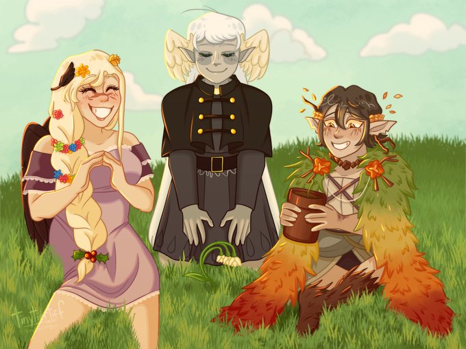 had this piece of the aasimars as a wip for like 4 months i just decided to finish it and the background. WELL, i put in a Little effort. sylvie (left) belongs to @baroviart and lir (right) belongs to @Valkysia. kaida (mid) is mine [ #dndart #DnDcharacter #DnD ]