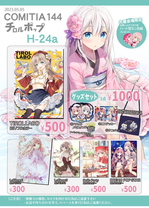 5/5開催 #コミティア144 【H24a】チロルポップ のお品書きになります。前回冬コミの既刊と久々に色紙を 持っていきます。よろしくおねがいします🌸 #コミティア144お品書き #COMITIA144