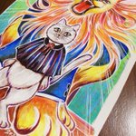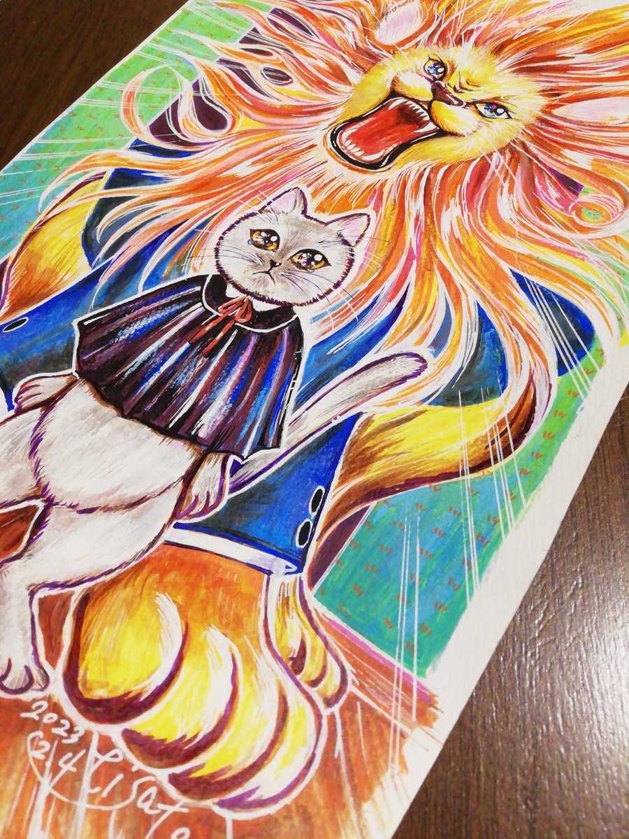 5月個展用作品の制作過程「猫の事務所 解散を命ずる」ラフ下描き→線画→着色→完成 かま猫、コート着てたのを変更、ライオン、スーツ着用に変更。画材POSCA コピック SARASA #アナログイラスト #絵柄が好みって人にフォローされたい