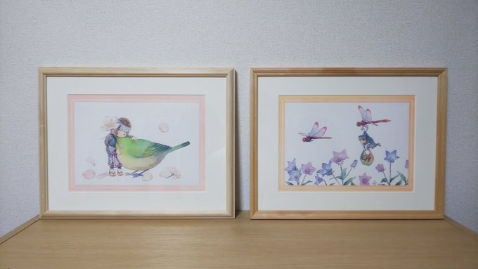 1 4 B-galleryから持って帰ってきた #名司生 さんの「春分」「秋分」を以前購入した「猫と薔薇」の近くに早速飾ってみる。 柔らかな優しい作品が加わる事でコレクションの幅が良い感じに広がった✨ リビングのアートエリアに素敵な作品が増えてとても嬉しいです😃 #水彩画 21/08/15 22:04