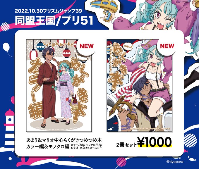 24 43 10/30 プリジャン39プリ51にて委託させて頂きます!あまリオらくがきまとめ本 ほぼ全部ツイログなのでサンプル無し。メディア欄遡ってね。去年の秋頃〜9月位までの絵がレポ以外全部入ってます。 🎃なのに夏仕様のコースター4枚+ポスカ+ペーパーのおまけ付 本当らくがきばっかりなので注意ですよ😅 22/10/18 21:43